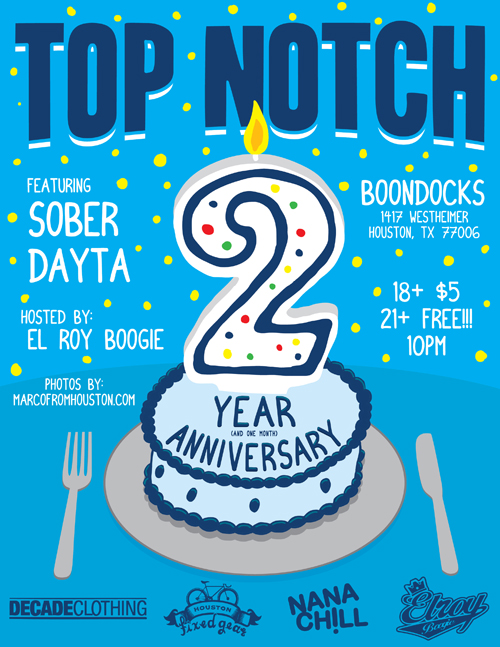 Tonight marks two years of Top Notch in Houston (technically 2 years one month). Come celebrate Top Notch’s toddler stage with us tonight at Boondocks. Always a rowdy time!