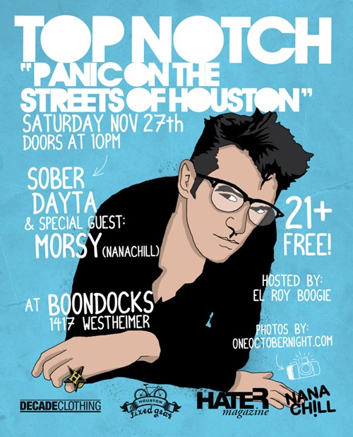 It’s a big Top Notch Holiday weekend. Last night was the final monthly party at Zubar. Keep your eyes peeled for some one off TN happenings around Dallas as well as the All Ages Top Notch starting next Saturday at The Loft. Tonight it goes down in the H. The Homie Morsy will be rocking with us and Nanachill will be in full effect mode. Come sweat of those extra lbs. you stacked on this week!